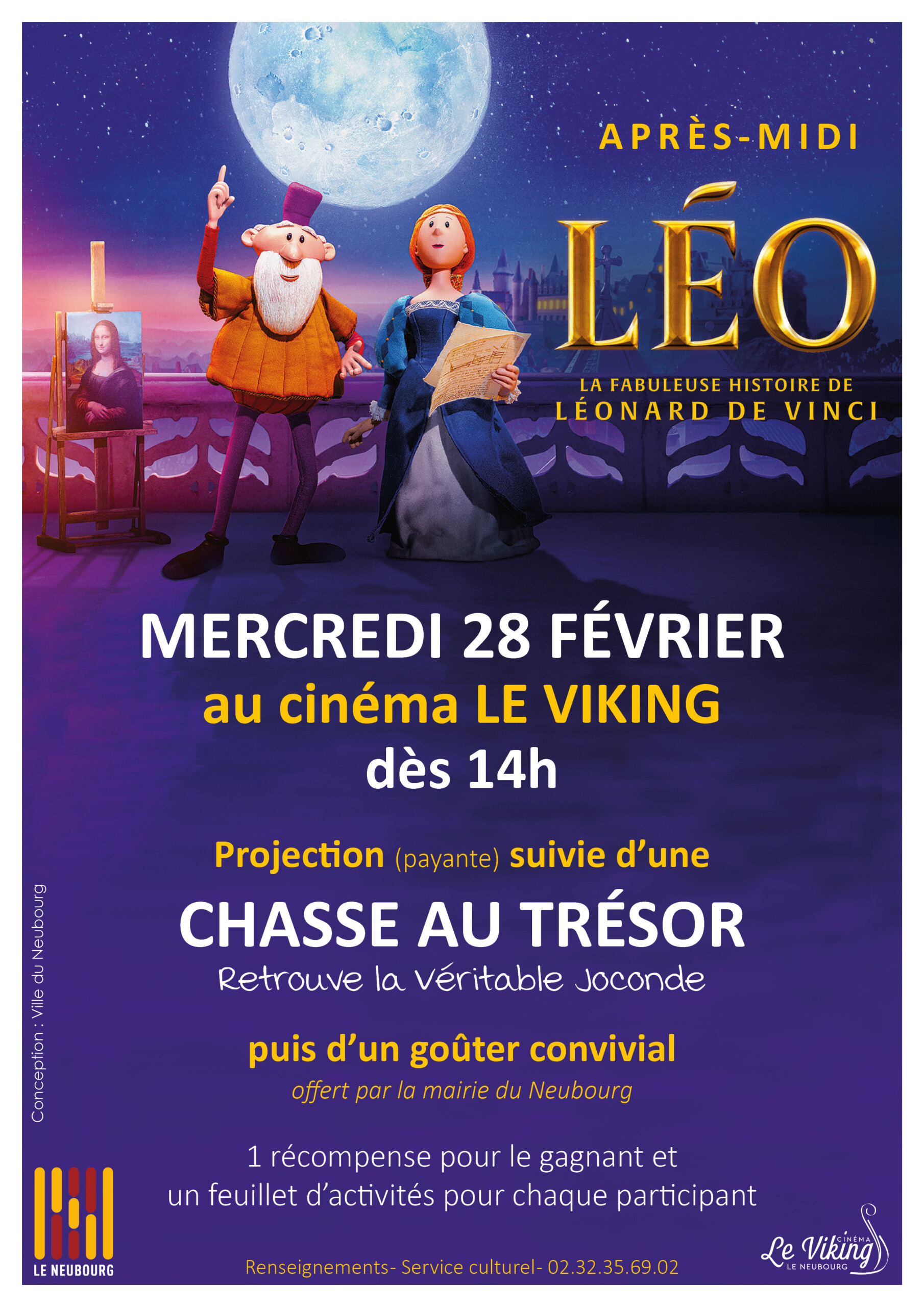 Projection du film « Léo, la fabuleuse histoire de Léonard de Vinci », expo, chasse au trésor et goûter ! Viens au cinéma Le Viking pour découvrir la vie extraordinaire de Léonard de Vinci ! Après la projection du film, participe à la chasse au trésor « Trouve la Véritable Joconde ! ». Une récompense […]