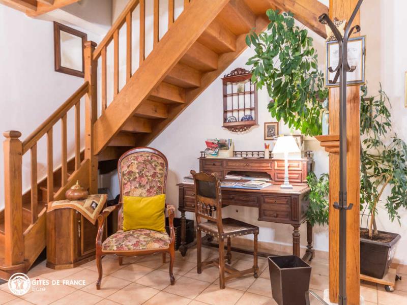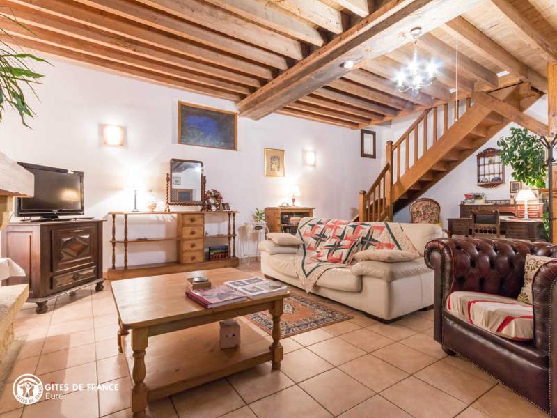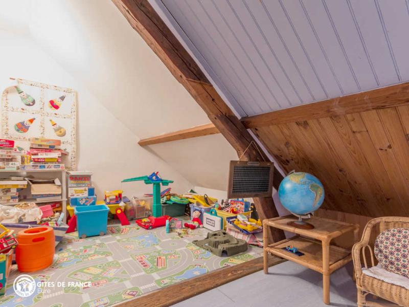 Dans ce cadre idyllique de la verte vallée de l'Iton, se niche ce très joli gîte, où Sharon et Jean-Christophe vous accueilleront avec plaisir. Pensé comme une vraie maison de vacances aux beaux espaces confortables, il possède tout ce dont vous aurez besoin pour passer un excellent séjour : portique, cheminée, bibliothèques et jeux pour enfant, sans oublier la salle de jeux aménagée dans la dépendance avec billard, baby-foot, air-hockey et ping-pong. A l'extérieur, un beau et grand jardin clos de 700 m², est en fleurs dès les beaux jours. Vous ferez également la connaissance de Teddy, l'adorable poney qui y réside. Au fond, l'Iton borde le terrain, mais en toute sécurité. A proximité, Acquigny, en bord de l'Eure, vous propose restaurants et commerces. Un peu plus loin, découvrez Louviers, petite ville dynamique et au sud Évreux et sa cathédrale. A deux kilomètres du gîte environ, les randonneurs seront ravis de pouvoir rejoindre le GR222. RDC : Entrée sur le grand salon chaleureux avec cheminée et coin bureau. Descente de quelques marches et accès à la cuisine avec espace repas, très bien équipée avec poêle à bois, lave-vaisselle, lave-linge et sèche-linge. Large ouverture sur le jardin. A L’ETAGE : Grande chambre avec lit double en 160X200 et lit bébé, avec sa salle de bain (baignoire et douche) et wc. Au demi-étage, accessible par un petit palier : chambre verte avec trois lits simples et salle de bain indépendante avec baignoire et wc. A l’étage supérieur : la troisième chambre, que les enfants choisiront avec un espace qui leur est vraiment adapté : bibliothèque et beau coin jeux. Deux lits simples.
